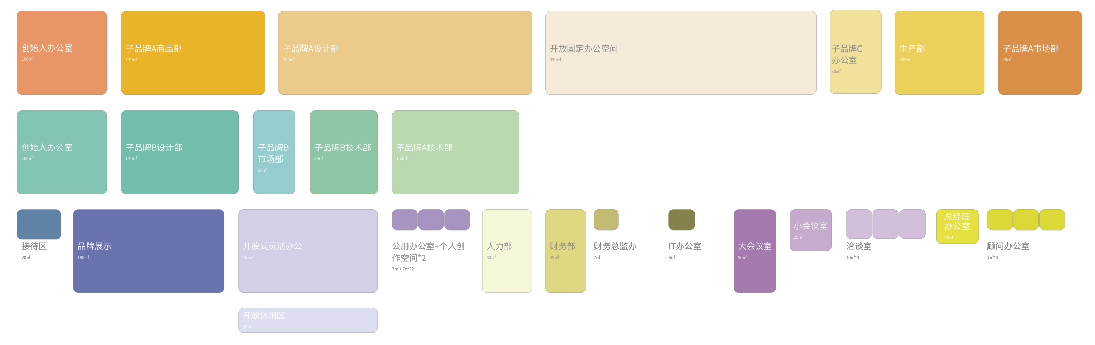 各组团内部子空间区分为内向型单元(高管办公室、仓储室、技术支持空间等)和外向型单元(自由工位、展厅等),前者按功能合并为规整体块(“建筑”),后者则大幅度开放(“中庭”),为提升用户沟通协作效率提供基础——即便是封闭单元内部也保留了一定弹性,可以按使用需求调节开放程度。