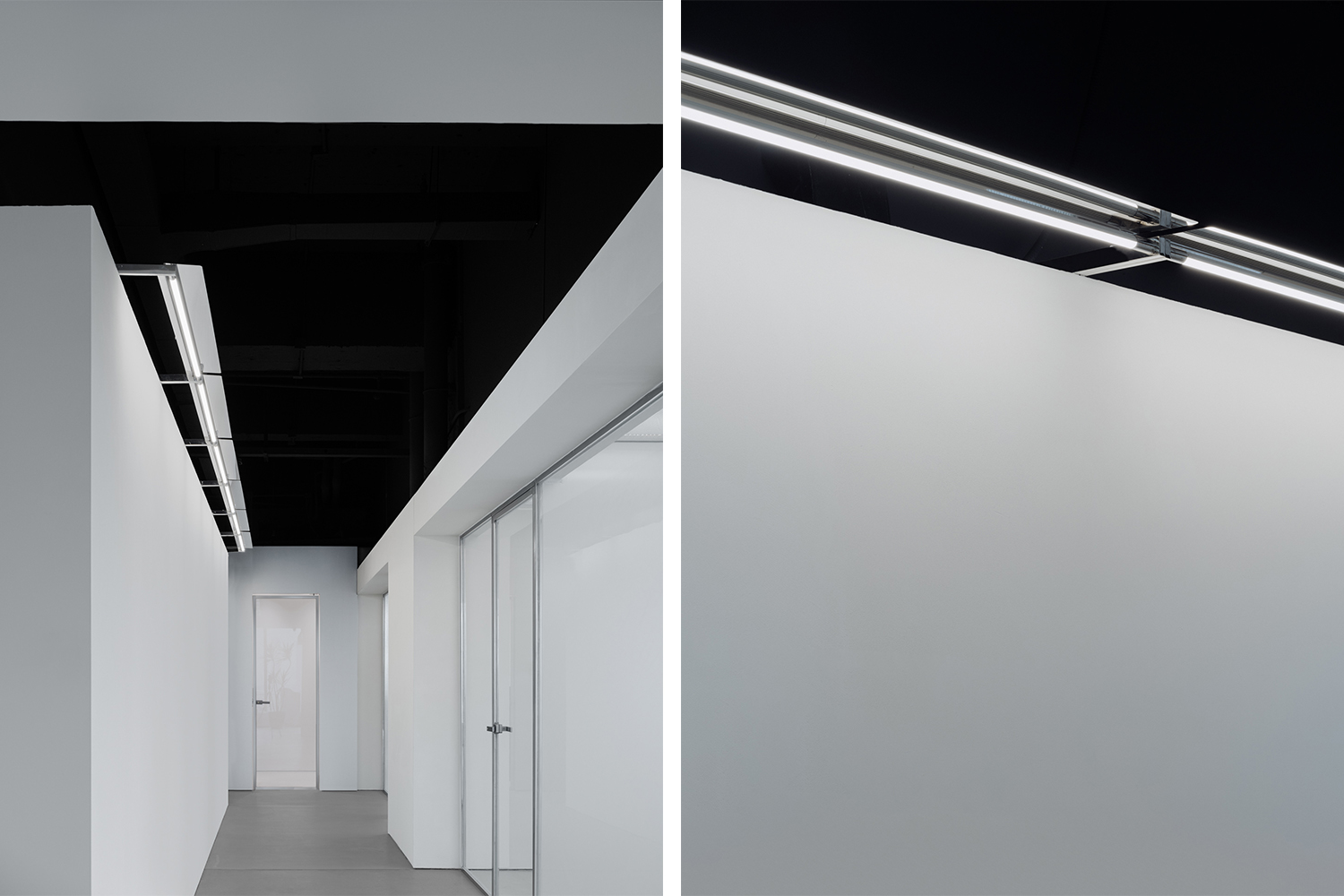 除了连通性,办公室与用户间的深层关系还要求设计在舒适度上有着更为精准的表达,这一点主要在灯光系统体现。空间并不是通亮的,照明相对柔和,聚集在工作面上,并按照工作性质匹配相应照度。主动线两侧安装的灯具则将照明分界线压低,有效减少了顶部原有复杂设备层对视觉造成的干扰。