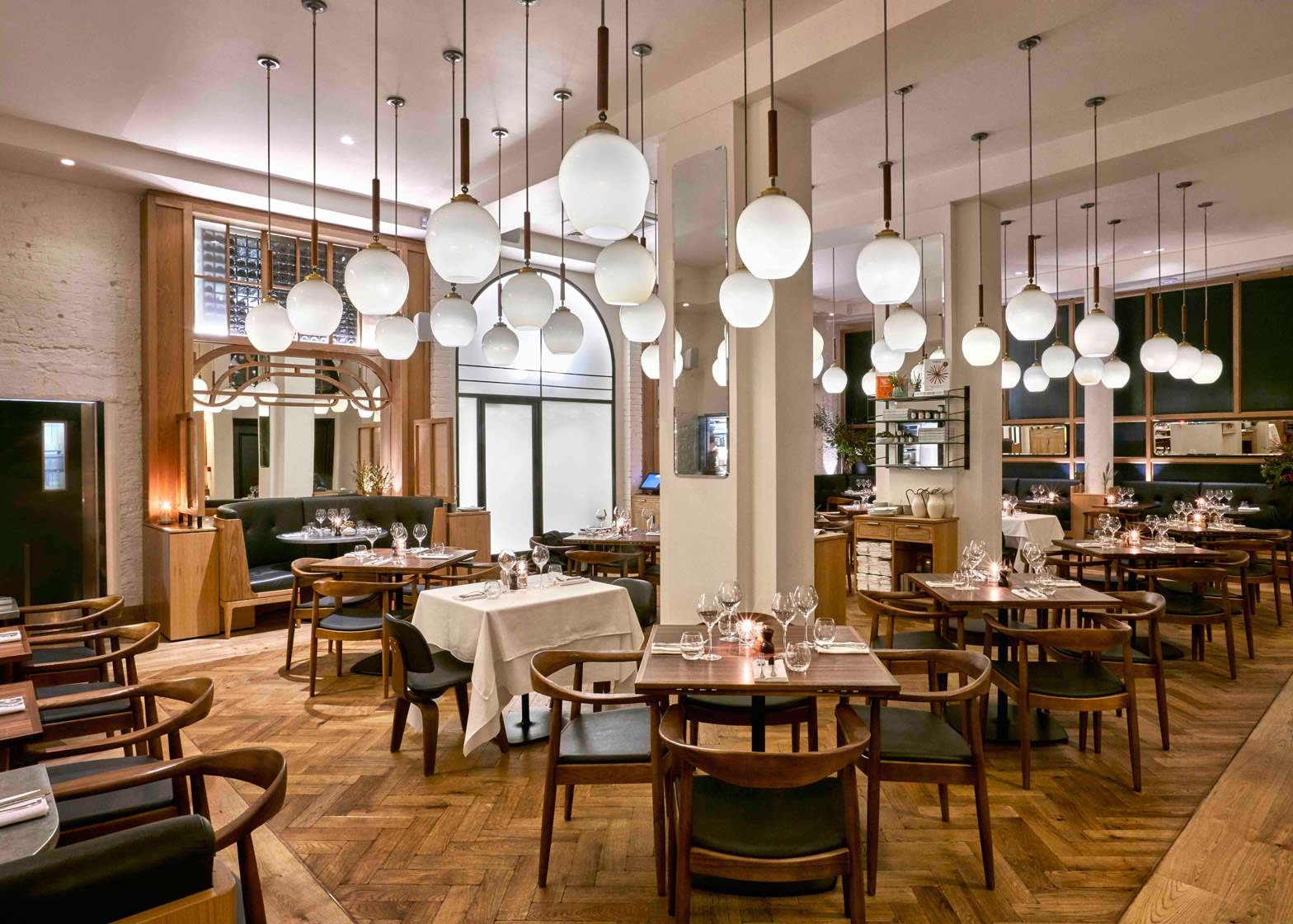 进入这家伦敦餐厅,映入眼帘的是顶上的传统手工吹制的白色玻璃球灯,和人字形木制地板。