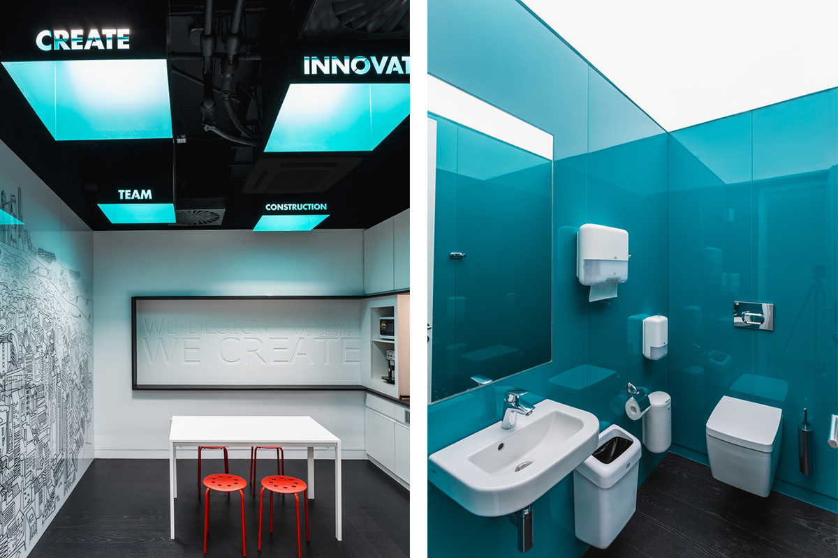 全玻璃“容器”提供了全面的城市景观,深绿绿色的玻璃墙是公司标志特色。创新灯具有隐蔽的光源,聚合物浇筑的板,会议室的智能玻璃,根据隐私要求改变其光学特性,变得更暗或完全透明,计算机硬件和屏幕之间的无线连接 – 所有这些技术作为未来与现在之间的联系,在一些突破性的,已经被证明的方法之间,已经进入了公司办公室的设计。