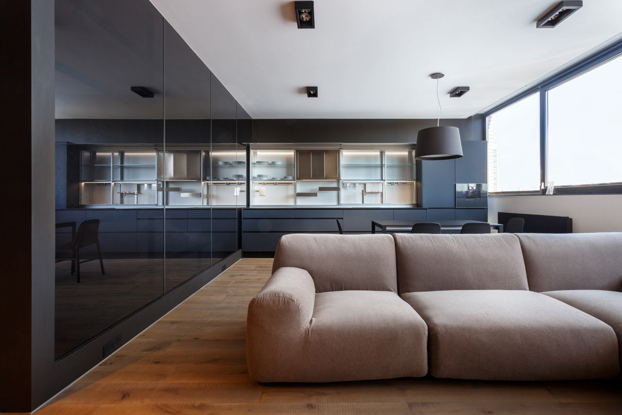 表面光滑整洁的厨房处处暗藏玄机,移动滑动门,一切都会完美的展现在眼前直至找到需要的东西。来自Kristalia的橱柜,表面光滑、黑亮,与餐桌椅依托、映衬。L型的绒面沙发色彩中性,蓝色烟雾玻璃的背后是浴室,铺满纹样瓷砖的一整面墙成为焦点并增添了一丝复古味道,卫浴五金件的颜色也附和着空间的黑色主基调。