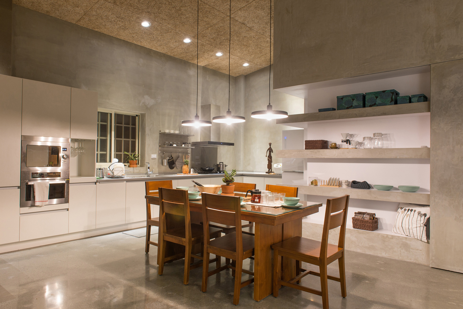 顺着卧室的偏移有助于东西方向的空气流通。这使得给两间卧室用的加大的半私密空间得以形成,延伸了空间的物理与视觉空间。屋面和墙体材料的基于不同的空间要求。天花板是由本地制造水泥木丝板,表现为开放的餐厅/生活/品茶空间良好的隔音;硅藻土墙面的装修让榻榻米室能够在封闭的空间内中和湿气;OSB板作为装饰墙,在楼梯处结合色彩,赋予了深度以高度。