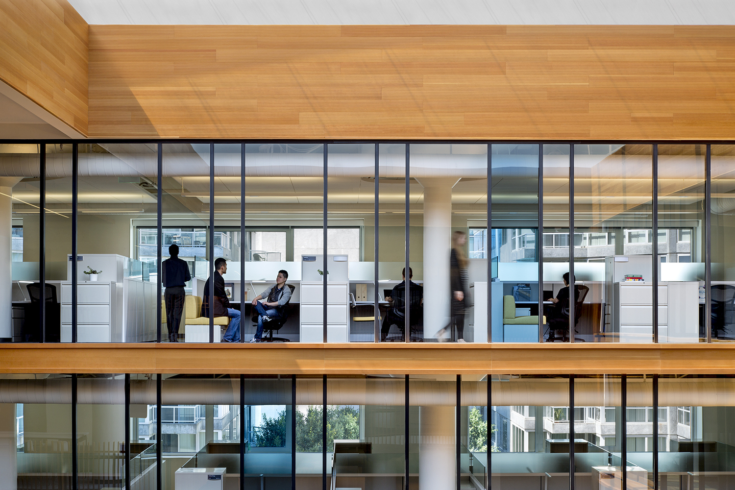 这座建筑虽然原本是为不同的时代和用途设计的,但它最显著的特色却正是对建筑本身的再利用。经过改造再利用的建筑目前正在争取获得LEED金级认证,再利用设计不仅使这栋总面积达46452平方米的建筑免于成为填埋垃圾的一部分,还对回收材料加以利用—包括用在楼梯踏板、台面和墙面的大部分外露木材—都源自于从项目附近的原港湾交通枢纽站拆除下来的拥有百年历史的木桩材。改造设计充分利用了建筑本身独有的特色财富,硕大的楼板恰好能够承载美轮美奂的新中庭,同时还能支撑关注内部活动的固定式建筑表皮。设计团队为员工和访客创造出了独树一帜的体验。