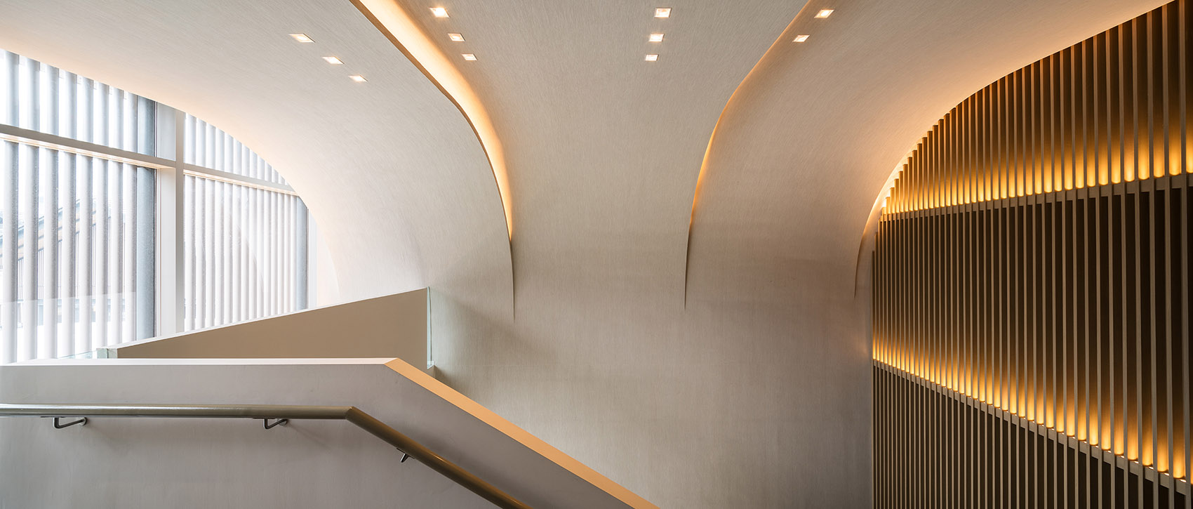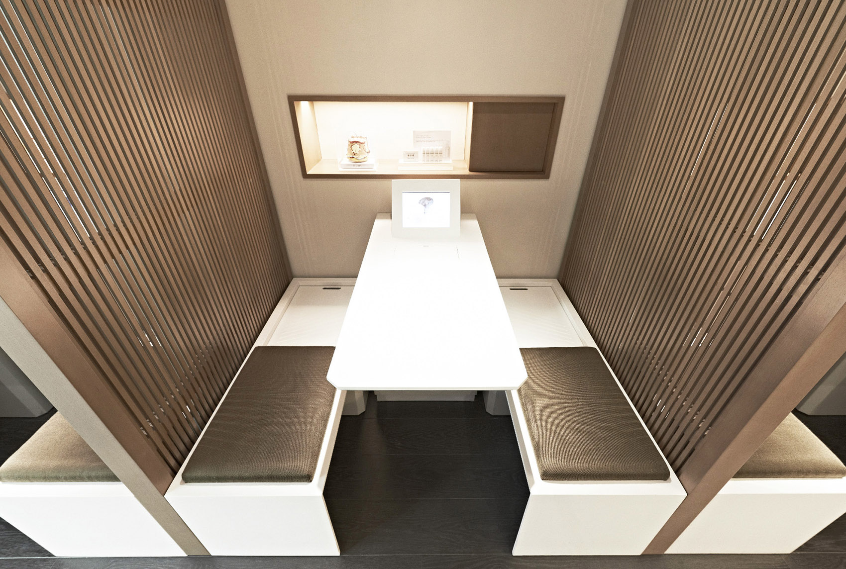 零售和理疗这两个服务功能在竖直方向分开。主题楼梯成为一个边界,和一个规划开放/私密,快/慢,疗养/spa空间的过渡区域。顾客沿着楼梯向上时,天花依次折叠,隐藏的上射灯照亮了墙面,营造出一个温暖舒适的氛围。第二层的空间单纯地被地灯照亮,这些地灯轻轻掠过墙面的底部,为顾客创造出一种禅意的体验,带领他们远离城市的喧嚣和繁忙。