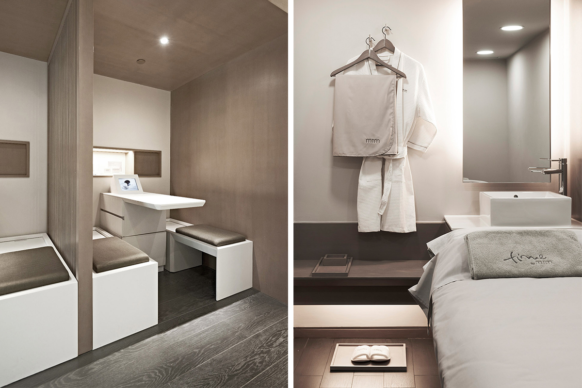 二层为宽敞的理疗区域,顾客可以在这里进行面部理疗和按摩。作为MTM品牌在中国的形象代表,MDO对这座新门店的概念设计强调了该品牌以科学研究和私人订制为核心的服务观念。基于品牌的日本起源,门店全新的视觉风格多采用中性色,并运用具有精致细节的天然石材和木材,突出了门店的空间感和边界感。