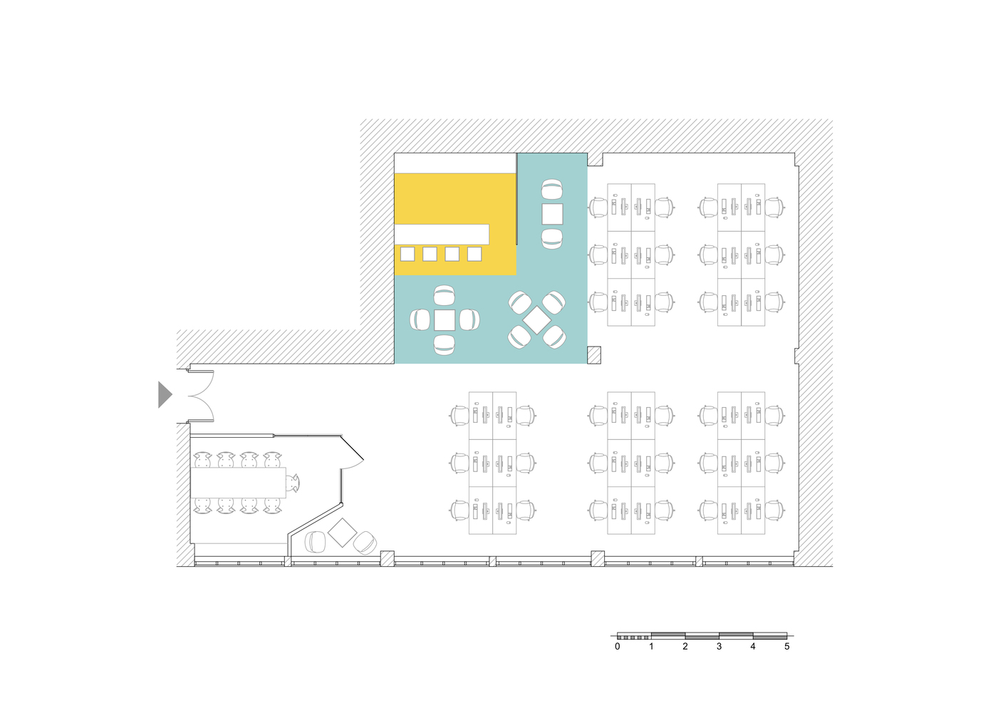 明亮的色彩,几何形状和暴露的混凝土天花板为这个内部营造一个动态,欢快和创造性的工作气氛。在设计过程中做出的第一个决定是保持旧苏联时代的工厂生产的混凝土板暴露,突出建筑的工业魅力。厨房设想像一个黄色的盒子在空间的角落。其明亮,高饱和度的黄色轮廓在空间中创造了一个看隐形体块,与室内唯一的物理体块品红色的会议室相互呼应。