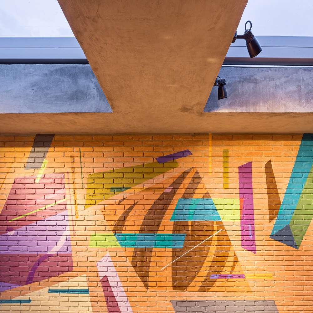 在该方案中,新的人行轴线连接了前后外墙,餐桌和服务区域被安置于一楼。在二楼,我们设计了看到“天空的景色”的屋顶穿透天窗,在巴西利亚长期干旱的季节下,得以打开密闭室内空间。厨房位于地下。所有的墙壁都是用裸露于空气中的陶瓷砖制成,就如同“白色帆布一样”,当地街头艺术家得以被邀请于此创作。所有的地板和天花板都是用裸露在外的混凝土制造。该方案的主要特点是设计中的“二层皮肤”,利用了通常用作栅栏的预制钢网。在这之中,我们使用了相同网格中的不同图案完成了覆盖外墙和天花板的多用途设计。在外墙室内外,该设计为双层,能支撑植被生长,标示时间的流逝,并且,在保护室内透明度的同时,保护空间避免过多直射阳光的侵害。而在一楼,作为通风悬吊天花板,又能为大多数餐厅的基础设施提供通道空间。