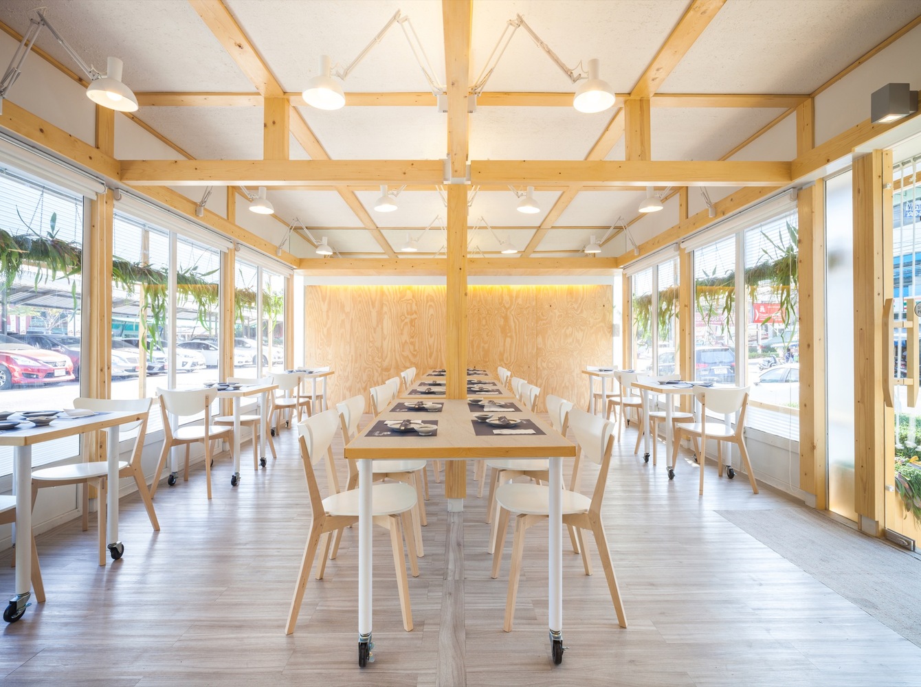 此外,我们可以在80厘米宽的缝隙中种植任何形式的植物,为顾客营造出一种自然的气氛。而在内部,木头的使用给予其柔软的质感。木头的颜色和穿透进来的阳光结合照明系统,令这间餐厅看起来更加明亮。由此,我们使用小灯作为主要照明,餐厅的光照强度可以依据需求调节。我们力求使顾客感受到家一样的温暖氛围。