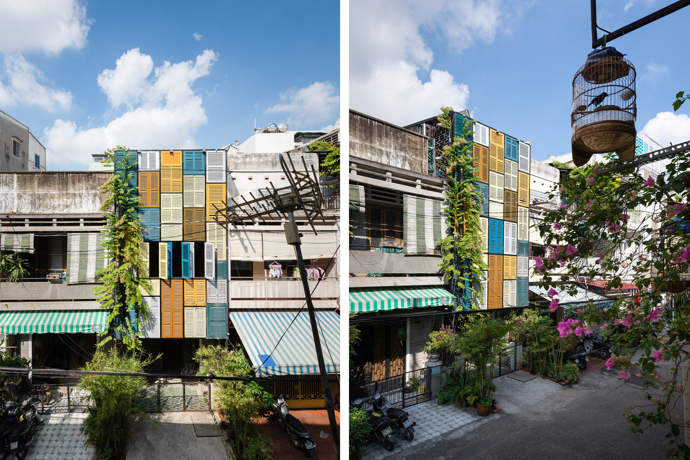 这些用于通风的窗扇在越南有悠久的历史。经过立面上的重新排列,这些五颜六色的窗户覆在旧立面之上,直通屋顶,不但引人注目,更与整个地区的历史气息协调一致。屋顶上开启的窗户为下方的树木带来了空间和阳光。它象征着生长,充满着对未来的希望和传统根基孕育的美好。