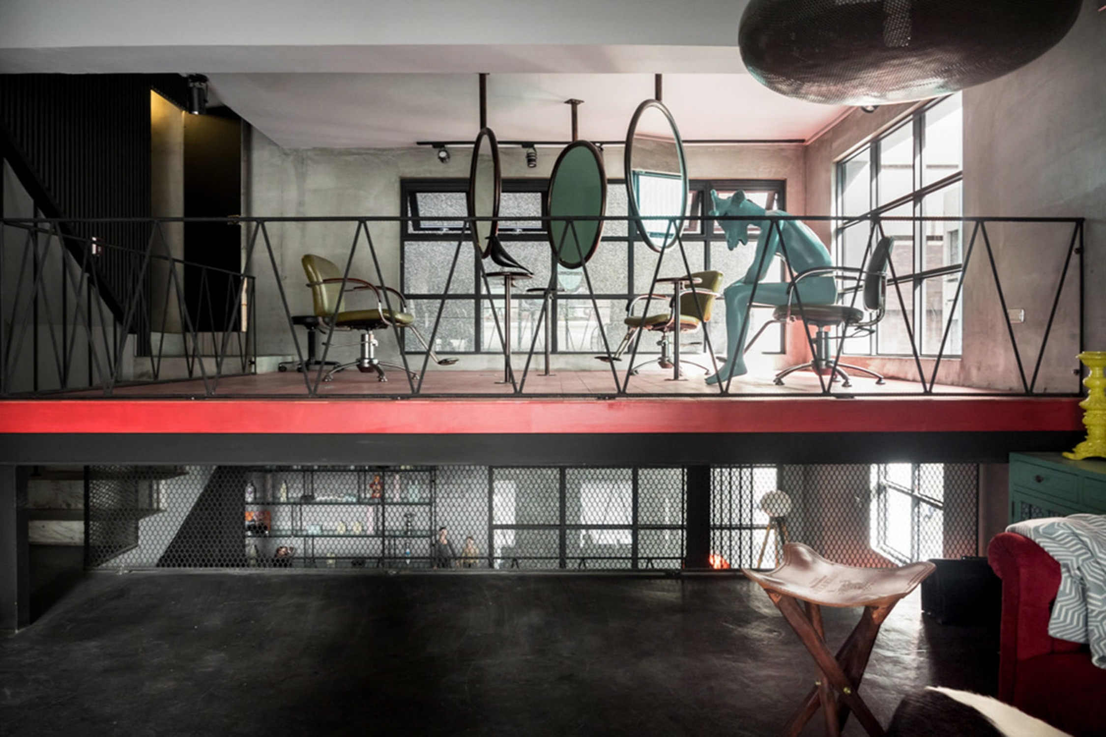 我们做的第一次翻新是修剪原始分层的尺度,看起来沉重和封闭,最后,它变成了开放和穿透的分层,使空间更具有多层次的感觉。在一楼,我们使用大量的阁楼元素,如管镜,集装箱墙,航空工业风格的椅子和混凝土作为基本色调与大胆的色彩森林,使客户的艺术收藏品美化为这个美发沙龙营造梦幻氛围。当人们走出第一层错层并且变成二楼时,(红色染色木材)的(拳击)竞技场分层是整个空间的主要焦点,透过金属网看,人们仍然能够观看位于第一个错层的艺术收藏品。