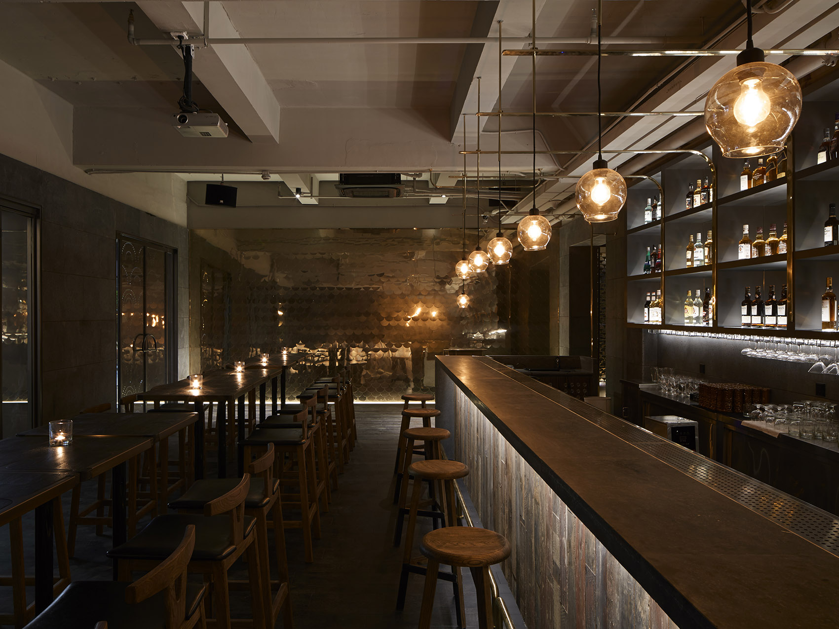 “天花通常会被忽略掉,但是对于这个项目我们希望大家能向上看。”继景说,当灯光透过天花挂片投射到墙面上时,就是‘云’的影子。 在室内空间中,粗糙的石材和老旧的木板诉说着醇厚,与有着模糊反射效果的铜瓦墙形成了不一样的对话。觥斛交错间,展现了设计师对于精品和细节的执着追求。 楼梯的灯光与材质,加上云影般的屏风造型,让空间更加充满时尚和朦胧感。 户外的露台也在这喧嚣的城市中提供了一片难得享有的宁静清雅。首层的酒吧用一整面铜墙提亮了环境,光线反射出的是颇有意思的模糊效果。这个是人们愿意约上三五好友来喝上一杯的地方。