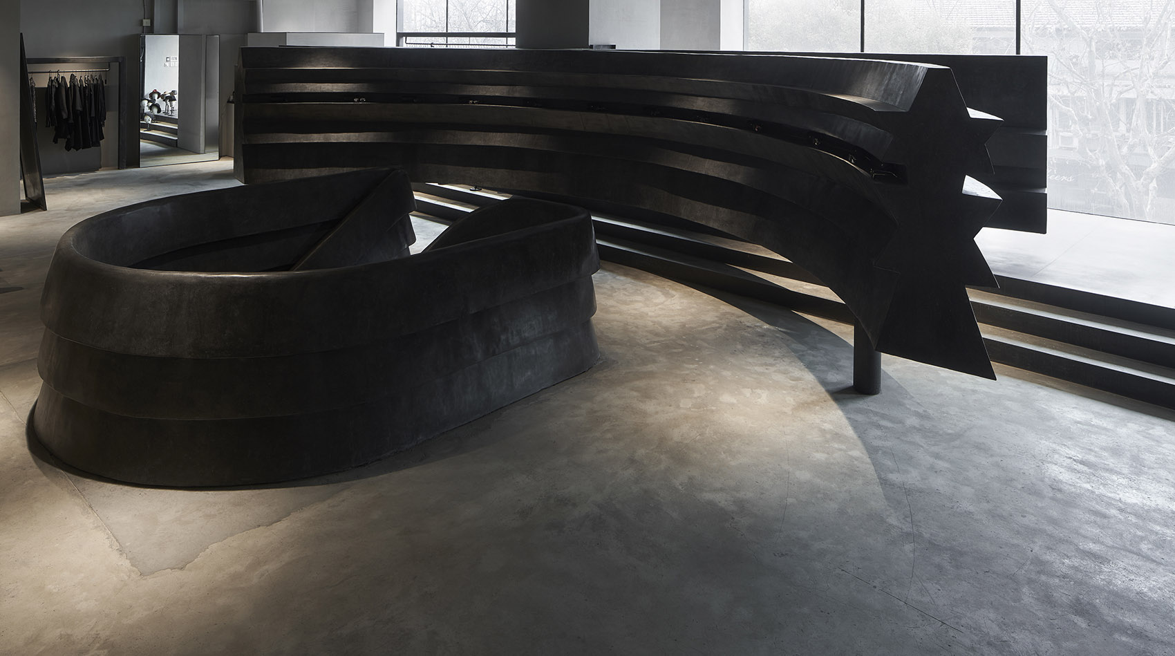 在一楼,门口立面没有橱窗,整个玻璃立面的内部,直接被一个巨大的半月形条纹体块进行屏风式的遮挡,2米高的体块,将空间穿透,扩张;延伸到一个同样条形体块的弧形楼梯,将上下两层空间连接。一楼中间位置是一张水磨石长桌,有就餐和服饰陈列两种功能,浇筑的黄玻璃块镶嵌,黄玻璃一体成型,如宝石镶嵌,桌子以时间作为分隔,平时是陈列台,聚会的时候作为吧台或者餐桌。横穿半个空间的条形水吧,由水磨石酒吧台和铜制水吧台合成,黄铜打破黑色的沉闷;像使者的盔甲的局部。