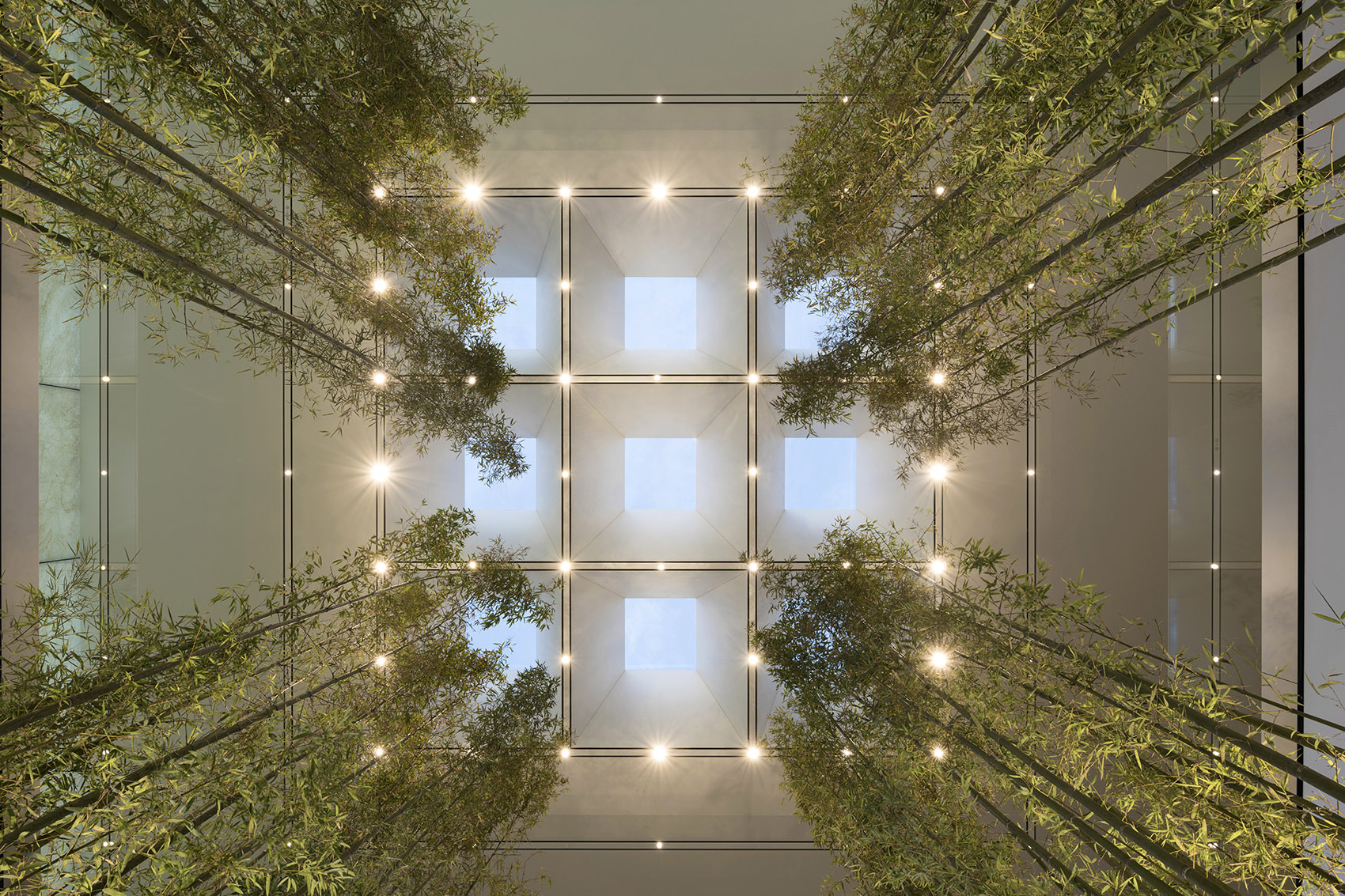 建筑的室内空间设计采用与户外广场的反向形态,设计师将与户外相同的静谧竹林移入高耸的中央大厅。位于竹林顶部的巨型天窗令日光倾泻,充斥在整个空间里。建筑底层由透明玻璃立面围合,视线游走在室内外的竹林之间,感受平静又丰富的层次变化,迷失在看不见的空间界限里。空间的尽端设有一面35英尺X15英尺(约10.6米X4.5米)的电视墙。电视墙侧边是与零售商店与赌场相邻的轴向入口,来访者便是从此处进入。