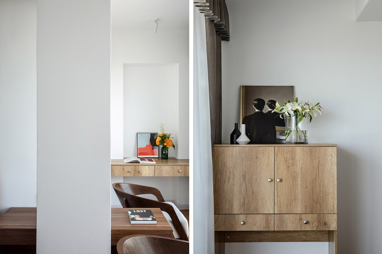 整体建筑及装饰风格现代简约,融合新中式以及日式元素。为了贴近大自然,室内及室外在用料上采用了很多还原生态的手法。大量天然麻石作为户外花园地面,用清水混凝土造型搭建了一个2米的围墙,又在视野最好的海边采用玻璃连接,使得建筑变得独立又联通景色。入户位置则在顶面开了圆,使得楼上的人能看到入户的景色而不是枯燥的顶面,而刚刚进入此建筑的人来说,又多了一个可以定义这个建筑的几何视角。在平面设计之初,两位主理人对酒店已经有了很清楚的人群定位,并为他们做了很细节的考虑。例如入门的这个洗脚间,私密而自然。她们希望到店的客人可以体验到极致的放松,所以让一切尽可能回归原始,不矫情亦不做作。