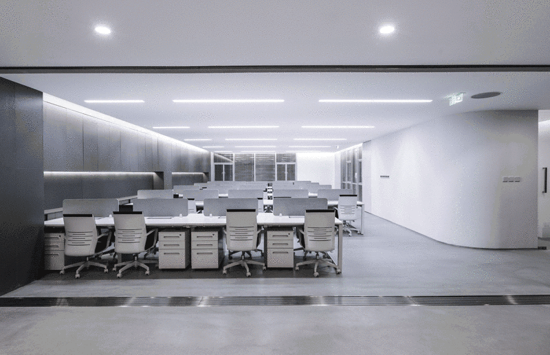 首先,将空间依据功能,从相对私密的会客区,到开放的工作区域依次排开。四堵可推拉丝网印刷玻璃墙,实现了空间在开放与私密之间的按需转换。当推拉墙体半开状态,玻璃墙被赋予屏风属性,位置及数量可按需变化,形成丰富的空间状态;墙体完全关闭,空间被分割成数个独立的私密小型空间;推拉墙体完全打开时,大小空间相互嵌套、融合,形成自由流动的空间。